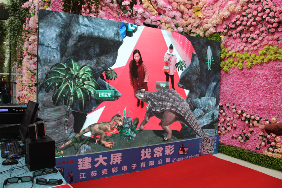 At the entrance of the conference hall, Jiangsu bright color electronic display of the hottest LED+3D+AR technology, through the big screen and human interaction, many participants in the side of the crowd, also want to experience a.